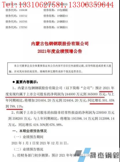 1月11日晚,鋼鐵板塊的牛股包鋼股份公布業績預告,預計2021年度實現歸屬于上市公司股東的凈利潤為24.4億元到36.5億元,與上年同期相比,將增加20.34億元到32.44億元,同比增長501.05%到799.11%;歸屬于上市公司股東的扣除非經常性損益的凈利潤為23.95億元到35.82億元,與上年同期相比,將增加19.34億元到31.21億元,同比增長419.50%到676.98%。
