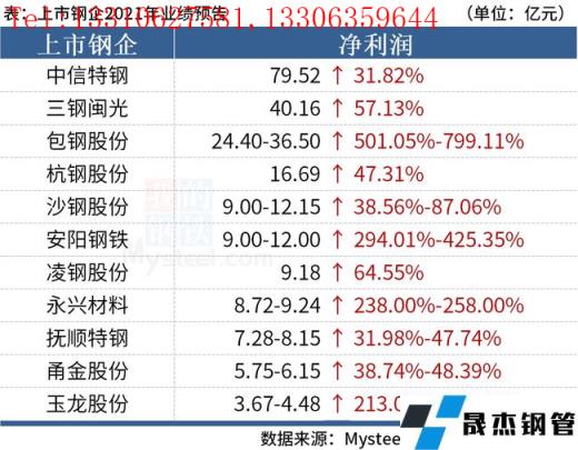 免責聲明:本網站(山東聊城晟杰無縫鋼管廠m.yztongfa.com)刊載的“2021年鋼企利潤創新高,中信特鋼實現凈利近80億”等均源于網絡,版權歸原作者所有,且僅代表原作者觀點,本文所載信息僅供參考。轉載僅為學習與交流之目的,如無意中侵犯您的合法權益,請及時聯系刪除。本網站刊登此篇文章并不意味著本站贊同其觀點或證實其內容的真實性,我們不對其科學性、嚴肅性等作任何形式的保證。如果侵犯了您的版權,請盡快聯系我們予以撤銷,謝謝合作!