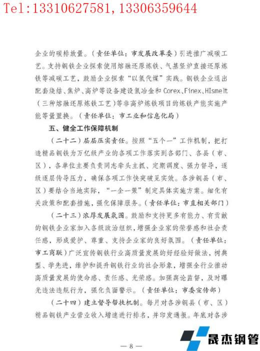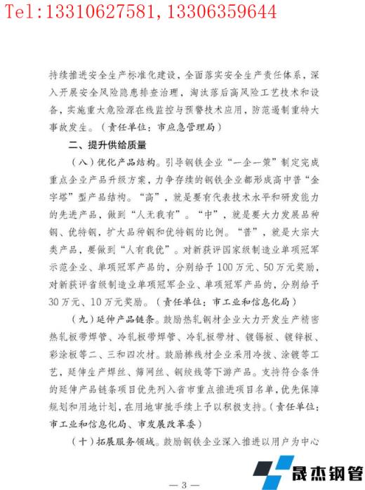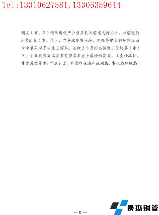 按照"五個(gè)一"工作機(jī)制,把打造精品鋼鐵為萬(wàn)億級(jí)產(chǎn)業(yè)的各項(xiàng)工作落實(shí)到各部門、各縣(市、區(qū)),結(jié)合當(dāng)?shù)貙?shí)際,"一企一策"制定具體實(shí)施方案。鼓勵(lì)和支持更多有能力、有貢獻(xiàn)的鋼鐵企業(yè)家加入各級(jí)政治組織,廣泛宣傳鋼鐵行業(yè)高質(zhì)量發(fā)展的好經(jīng)驗(yàn)好做法,維護(hù)和提升鋼鐵行業(yè)的社會(huì)形象。加強(qiáng)輿論監(jiān)督,及時(shí)曝光違法違規(guī)行為。建立督導(dǎo)幫扶機(jī)制。每月、年底對(duì)各涉鋼縣(市、區(qū))精品鋼鐵產(chǎn)業(yè)營(yíng)業(yè)收入增速進(jìn)行排名,對(duì)增速前3名的縣(市、區(qū)),在爭(zhēng)取配置土地、能耗等要素和環(huán)保正面清單準(zhǔn)入時(shí)予以重點(diǎn)傾斜。