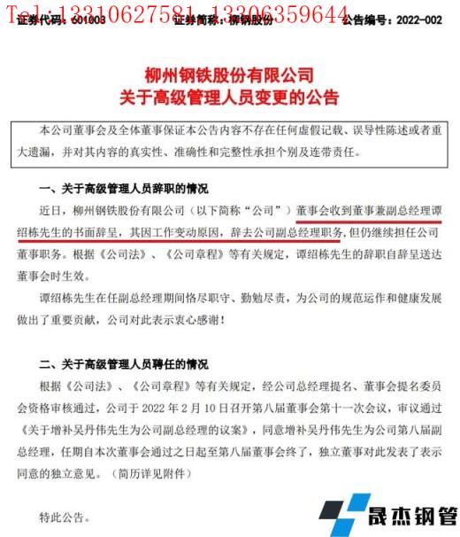 2月10日,柳州鋼鐵股份有限公司發(fā)布關(guān)于高級管理人員變更的公告。公告顯示,柳鋼股份董事會收到董事兼副總經(jīng)理譚紹棟的書面辭呈,其因工作變動原因,辭去柳鋼股份副總經(jīng)理職務(wù),但仍繼續(xù)擔(dān)任柳鋼股份董事職務(wù)。