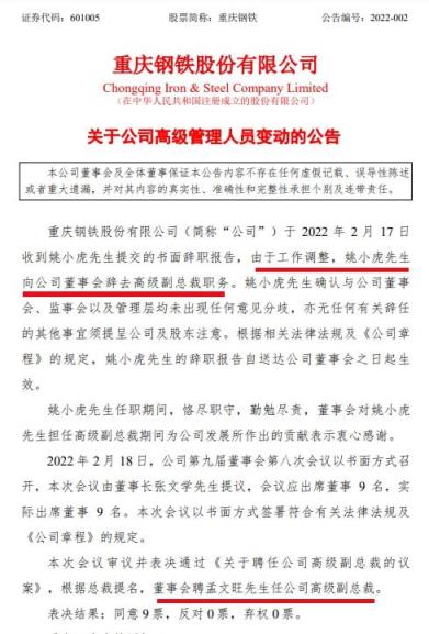 重慶鋼鐵姚小虎辭職!孟文旺獲聘高級副總裁