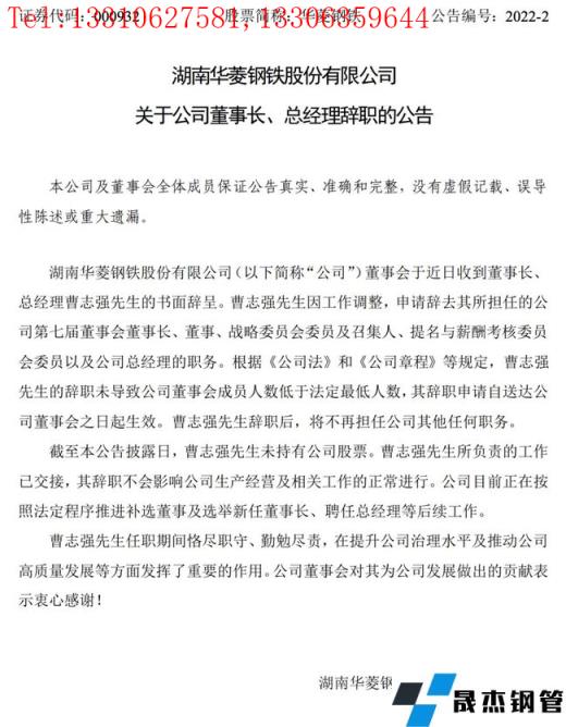 日前,湖南華菱鋼鐵股份有限公司發(fā)布公告稱,公司董事會于近日收到董事長、總經(jīng)理曹志強(qiáng)的書面辭呈。曹志強(qiáng)因工作調(diào)整,申請辭去其所擔(dān)任的公司第七屆董事會董事長、董事、戰(zhàn)略委員會委員及召集人、提名與薪酬考核委員會委員以及公司總經(jīng)理的職務(wù)。
