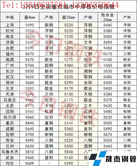 截至3月9日,全國主要城市普8mm中厚板均價5609元/噸,周環(huán)比上漲50元/噸;普20mm中厚板均價5290元/噸,周環(huán)比上漲52元/噸;低合金20mm均價5492元/噸,周環(huán)比上漲53元/噸。以下為3月4日與3月9日全國重點(diǎn)城市中厚板價格指數(shù)對比情況: