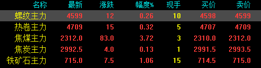 今日螺紋主力期貨漲12,收報4599,漲幅0.26%;熱卷主力漲15,收報4709,漲幅0.32%;焦煤主力漲83,收報2312,漲幅3.72%;焦炭主力漲4,收報2992.5,漲幅0.13%;鐵礦石主力漲7.5收報715,漲幅1.06%。