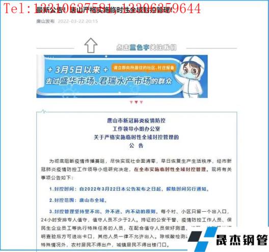 3月22日20時許,唐山發(fā)布《關(guān)于嚴(yán)格實施臨時性全域封控管理的公告》:自本公告發(fā)布之日起,唐山市實施臨時性全域封控管理。除核酸檢測以及應(yīng)急突發(fā)事件等特殊情況外,農(nóng)村居民不得出戶,城鎮(zhèn)居民不得出樓門口。