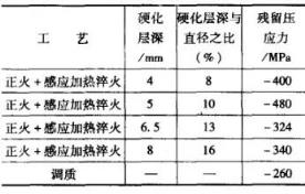 ▲圖4半軸表面淬火的硬化層深度花鍵部:齒根硬化層深度(按測量到半馬氏體區(qū)計算)應(yīng)達到花鍵部軸頸的10%(δ1=10%D)。桿部:硬化層深度應(yīng)達到桿部直徑的15%(δ2=15%D0)。法蘭根部:要求法蘭盤與桿部連接的過渡圓角淬硬。在實際生產(chǎn)中,圓角處硬化區(qū)域的最小直徑應(yīng)比半軸桿部直徑大25%。這些要求是為了保證半軸的靜強度和疲勞強度。花鍵與桿部的淬硬層深度對靜強度影響較大,法蘭圓角淬硬對疲勞極限影響較大。每種表面淬火半軸都有最佳的硬化層深,應(yīng)考慮到硬化層深對表層殘留壓應(yīng)力的影響。表6 列出了直徑為50mm的帶法蘭半軸感應(yīng)加熱淬火后花鍵尾根部位的殘留壓應(yīng)力。▼表640MnB半軸感應(yīng)淬火后表面殘留壓應(yīng)力