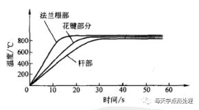 ▲圖7采用矩形感應(yīng)器整體一次感應(yīng)加熱淬火時,半軸表面的均溫加熱曲線由于在有效圈A端圓弧(見圖6) 上鑲有硅鋼片導(dǎo)磁體,所以法蘭根部圓角部位升溫較快,加熱均溫時間長,保證了該處的硬化層深和足夠的硬化區(qū)域。采用整體一次感應(yīng)加熱淬火還能提高花鍵齒頂?shù)挠捕取2捎镁匦胃袘?yīng)器加熱時,由于感應(yīng)器和零件之間間隙較大(一般為5~8mm),所以升溫慢,加熱時間長,硬化層厚且均勻。半軸回火也可采用矩形感應(yīng)器加熱,采用15~20℃/s的升溫速度,控制感應(yīng)加熱回火溫度在(250±10)℃范圍內(nèi),可以使半軸表面硬度控制在52~63HRC的范圍內(nèi),性能良好。