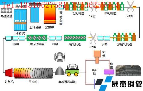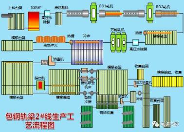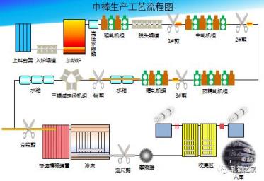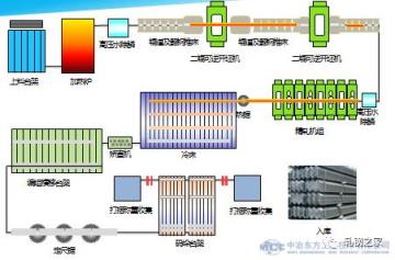 加熱爐、高壓水除鱗、軋機、輪廓儀或測徑儀、剪或鋸、熱打印機、冷床、矯直機、編組臺架、碼垛臺架、打捆機、稱重設備、噴標等設備