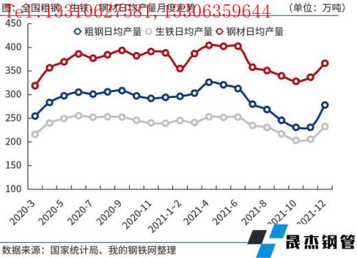 12月份,全國(guó)粗鋼日均產(chǎn)量278.04萬噸,環(huán)比大增20.3%,超過市場(chǎng)預(yù)期。一方面,由于11月份鐵礦石、焦炭等原燃料價(jià)格大幅下跌,12月份無縫鋼管廠家生產(chǎn)成本明顯下降,效益好轉(zhuǎn)推升擴(kuò)產(chǎn)意愿。另一方面,2021年全國(guó)粗鋼產(chǎn)量壓減工作提前完成,為此12月份各地?zé)o縫鋼管廠家普遍出現(xiàn)復(fù)產(chǎn)。