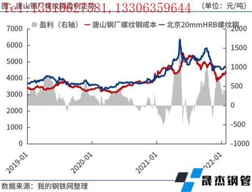 成本方面,據(jù)筆者測(cè)算,1月底唐山長(zhǎng)流程無縫鋼管廠家螺紋鋼噸鋼毛利(成本不包含三項(xiàng)費(fèi)用、折舊等)300元/噸左右。由于1月份原燃料價(jià)格漲幅高于鋼價(jià),導(dǎo)致無縫鋼管廠家效益有所下滑,部分電爐廠因虧損減產(chǎn)。