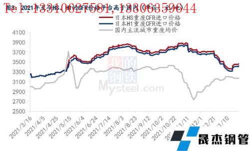 放開廢鋼進口后的首年,進口量卻不及預期,2021年進口總量僅為55.5萬噸,遠低于2019年之前平均每年200萬噸以上的水平。原因主要有兩方面:一是政策導向,2021年能夠入境的再生鋼鐵料所對應的海關商品編碼只有5類,其對應的海關編碼分別是:7204100010(鑄鐵碎料)、7204210010(不銹碎料)、7204290010(其他合金碎料)、7204410010(粉狀廢料)、7204490030(其他廢碎料),上述類別均屬于純凈的優質廢鋼,政策決定了廢鋼的進口門檻變高;二是以日本優質重廢HS、H1為例,兩種料形的CFR價格平臺在2021年中均高于國內主流城市的重廢均價(圖3),由于這兩種料形均屬于日本國內的優質廢鋼,其資源量本身就有限,出口量不大,外加東亞地區的其他國家也會從日本進口該料形,所以這種優質廢鋼在2021年中基本處于供小于求的狀態,價格因此高企。但以日本中廢H2為例,由于該料形要差于HS、H1,所以H2料形的CFR價格平臺接近國內主流城市的中廢均價(圖4)。