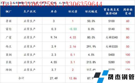 2月7日山東優(yōu)特?zé)o縫厚壁鋼管廠家棒材總庫存27.49萬噸,較節(jié)前增加12.86萬噸,增幅88%,較去年春節(jié)后庫存減少3萬噸。