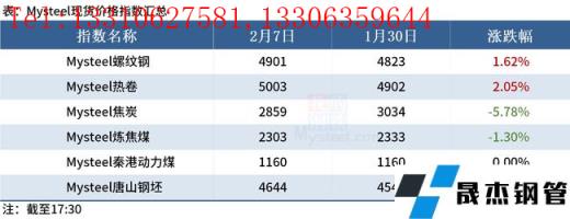 ◎ 2月7日,全國31個(gè)主要城市螺紋鋼均價(jià)4892元/噸,較節(jié)前(1月30日)上漲75元/噸;全國24個(gè)主要城市熱軋板卷均價(jià)5011元/噸,上漲97元/噸。