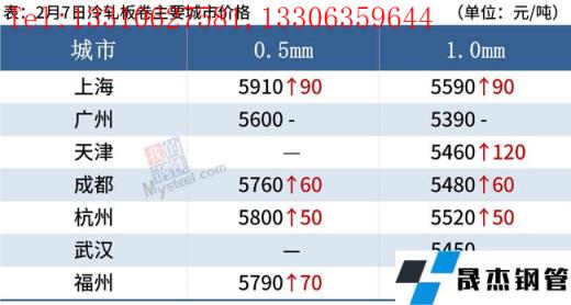 冷軋板卷:2月7日,全國24個主要城市1.0mm冷卷均價5525元/噸,較節前(1月30日)上漲57元/噸。據市場反饋,今日大部分鋼貿企業未全面復工,大部分陸續要8-10號陸續進入復工,當前市場暫無明顯成交,受原材料價格提漲,冷軋貿易商先提漲價格,市場呈有價無市狀態?;久婵?,截止6號調研數據顯示,冷軋無縫厚壁鋼管廠家產能利用率79.10%,周環比減少2.31%;廠庫周環比增加7.16萬噸,社庫周環比增加8.45,月環比增加12.30萬噸,年同比增加14.03萬噸,基本面壓力尚可。預計8日全國冷軋板卷現貨價格多震蕩上調為主。