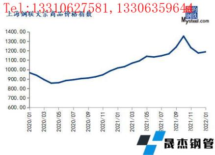 2022年1月份,上海鋼聯中國大宗商品價格指數(MyBCIC)終值為1187.71,同比上漲16.80%,環比上漲1.09%。