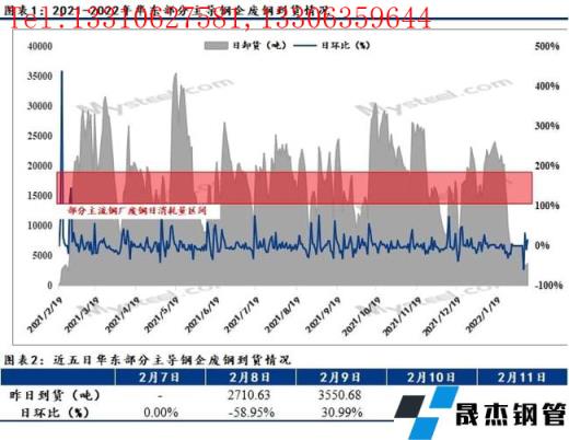 本省無縫厚壁鋼管廠家到貨情況基本處于往年同期低位水平,以本省主導鋼企為例,截止11日統計本省主導鋼企廢鋼到貨昨卸3710.52噸,較前一日增14.75%;今總計到船10條,海船3條,大小車20車?;仡欓_市以來的到貨情況,本省主導鋼企日均到貨遠低于日耗水平,完全處于耗庫狀態,且耗庫速度相對較快。因此,為滿足無縫厚壁鋼管廠家日耗所需,主導鋼企廢鋼采購價格拉漲或為大勢所趨。