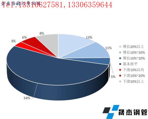 8、樣本企業當前訂單狀況:增長20%以上的企業占比13.48%,增長10-20%的企業占比11.24%;增長10%以內的企業占比4.49%;基本持平的企業占比53.93%;下滑10%以內的企業占比3.37%;下滑10-20%的企業占比5.62%;下滑20%以上的企業占比7.87%。