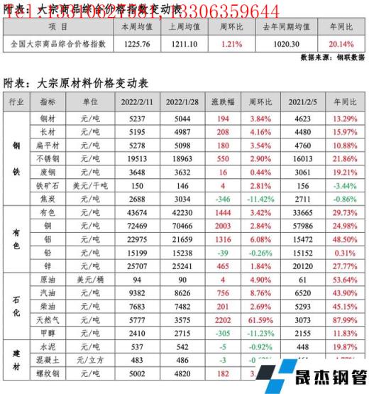 免責聲明:本網站(山東聊城晟杰無縫鋼管廠m.yztongfa.com)刊載的“MRI:大宗原材料價格周報(2月7日-2月11日)”等均源于網絡,版權歸原作者所有,且僅代表原作者觀點,本文所載信息僅供參考。轉載僅為學習與交流之目的,如無意中侵犯您的合法權益,請及時聯系刪除。本網站刊登此篇文章并不意味著本站贊同其觀點或證實其內容的真實性,我們不對其科學性、嚴肅性等作任何形式的保證。如果侵犯了您的版權,請盡快聯系我們予以撤銷,謝謝合作!