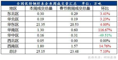 全國優特鋼棒材樣本企業成交量25.15萬噸,較節前一周成交增1.67,增幅7.1%。