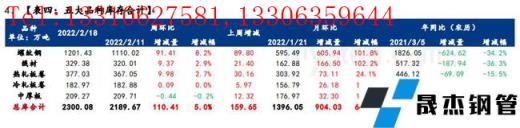 據統計,本周五大品種庫存總量為2300.08萬噸,環比上周增加110.41萬噸,其中建材庫存增加100.78萬噸,增幅為7.0%;板材庫存增加9.63萬噸,增幅1.3%。上期庫存總量為2189.67萬噸,環比節后第一周增加159.65萬噸,其中建材庫存增加111.2萬噸,增幅為8.4%;板材庫存增加48.45萬噸,增幅6.8%。