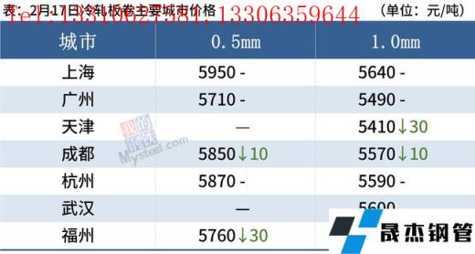 冷軋板卷:2月17日,全國24個主要城市1.0mm冷卷均價5573元/噸,較上個交易日下跌7元/噸。今日黑色系期貨盤面整體震蕩偏弱運行,市場心態(tài)下滑,近兩日現(xiàn)貨市場價格均陸續(xù)回落,再加上市場“買漲不買跌”的情緒居高不下,今日整體成交一般。庫存方面,據(jù)不完全統(tǒng)計,現(xiàn)冷軋無縫厚壁鋼管廠家?guī)齑?0.94萬噸,周環(huán)比減少2.77萬噸,社會庫存142.03萬噸,周環(huán)比增加2.86萬噸,周消費量80.71萬噸,環(huán)比增加13.02萬噸。綜合來看,故預(yù)計18日國內(nèi)冷軋板卷價格或?qū)⒎€(wěn)中偏弱運行。