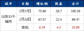 本周省內建筑厚壁無縫鋼管市場社會庫存大幅增加。截至2月17日,據我網調研山東省主流市場包括青島、臨沂、濟南三大市場的樣本倉庫建筑厚壁無縫鋼管社會庫存總量為56.36萬噸,較上一周同期增加9.58萬噸,增幅17%。具體情況如圖1所示。
