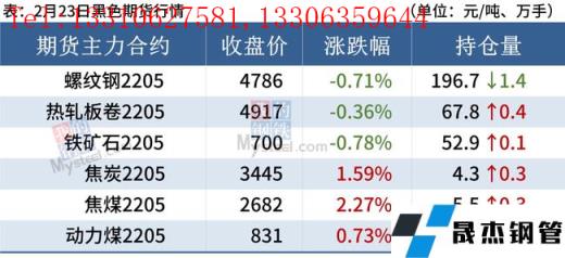 2月23日主要觀點(diǎn):①、全國(guó)31個(gè)主要城市20mm三級(jí)抗震螺紋鋼均價(jià)4930元/噸,較上個(gè)交易日跌9元/噸。預(yù)計(jì)24日國(guó)內(nèi)建筑厚壁無縫鋼管或?qū)⒕S持弱勢(shì)運(yùn)行。②、全國(guó)24個(gè)主要城市4.75mm熱軋板卷均價(jià)5025元/噸,較上個(gè)交易日下跌10元/噸。預(yù)計(jì)24日熱軋板卷價(jià)格或窄幅震蕩運(yùn)行。③、全國(guó)24個(gè)主要城市1.0mm冷卷均價(jià)5575元/噸,較上個(gè)交易日下跌5元/噸。預(yù)計(jì)24日全國(guó)冷軋板卷價(jià)格或?qū)⒄鹗幤踹\(yùn)行。④、全國(guó)24個(gè)主要城市20mm普板均價(jià)5187元/噸,較上一交易日下跌11元/噸。預(yù)計(jì)24日中厚板價(jià)格或?qū)⑷砸员P整運(yùn)行為主。⑤、全國(guó)45個(gè)主要市場(chǎng)廢鋼平均價(jià)3195元/噸,較上一交易日價(jià)格降1元/噸。預(yù)計(jì)短期廢鋼市場(chǎng)價(jià)格窄幅震蕩運(yùn)行。⑥、山東進(jìn)口鐵礦石現(xiàn)貨市場(chǎng)報(bào)價(jià)先漲后跌,整體交投情緒較為冷清,貿(mào)易商多一單一議,無縫厚壁鋼管廠家按需采購(gòu)。⑦、焦炭市場(chǎng)暫穩(wěn)偏強(qiáng)運(yùn)行。焦炭第一輪提漲200元/噸,主流無縫厚壁鋼管廠家暫無回應(yīng)。預(yù)計(jì)第一輪提漲本周有望落地,預(yù)計(jì)短期內(nèi)焦炭市場(chǎng)暫穩(wěn)偏強(qiáng)運(yùn)行。