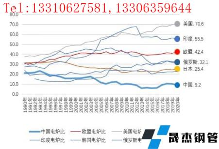 電爐鋼是以電力為能源、以再生鋼鐵料為原料的煉鋼爐生產(chǎn)的鋼。這種短流程煉鋼與以鐵礦石為主要原料的長(zhǎng)流程煉鋼在原料使用上有本質(zhì)的區(qū)別。從電爐鋼的占比情況看,中國(guó)粗鋼生產(chǎn)90%以上依賴長(zhǎng)流程,即以鐵礦石為主要原料的生產(chǎn)方式,并且受制于國(guó)產(chǎn)鐵精礦的產(chǎn)量不足,對(duì)進(jìn)口鐵礦石的依存度很高。截止到2020年,據(jù)世界鋼協(xié)(WSA)的統(tǒng)計(jì)數(shù)據(jù),全球電爐鋼產(chǎn)量占比為26.1%。主要產(chǎn)鋼國(guó)中,美國(guó)為70.6%,土耳其為69.2%,印度電爐比為55.5%,歐盟(28)為42.4%,俄羅斯為32.1%,韓國(guó)為31.0%,日本為25.4%。中國(guó)電爐鋼占比在20世紀(jì)90年代曾超過(guò)20%,但由于之后中國(guó)長(zhǎng)流程煉鋼規(guī)模迅速擴(kuò)大,電爐鋼占比不斷被稀釋,至2020年已降至9.2%。從目前情況看,美國(guó)、印度和歐盟鋼鐵生產(chǎn)對(duì)鐵礦石依存度相對(duì)低很多。
