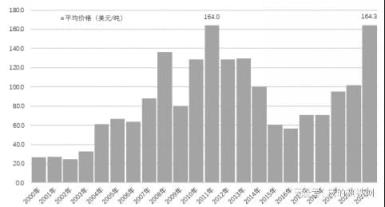 2000年-2021年中國(guó)進(jìn)口鐵礦石年度平均價(jià)格走勢(shì)圖