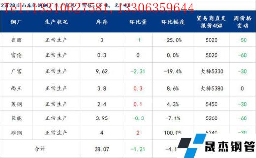 數據:山東優特無縫厚壁鋼管廠家庫存28.07萬噸,環比增下降1.21萬噸,減少4.13%,同比增加2.87萬噸,增長11.39%。