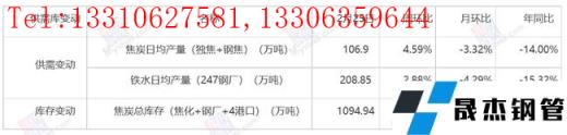 目前無縫厚壁鋼管廠家利潤尚可,對于焦價有包容空間;但近日鋼坯價格接連下跌,無縫厚壁鋼管廠家利潤逐步收縮,若鋼價繼續下跌,焦炭上漲,無縫厚壁鋼管廠家利潤收到擠壓,無縫厚壁鋼管廠家很難再接受焦炭漲價,畢竟焦炭的供應也并非特別緊張。