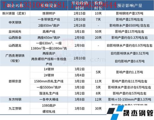 據不完全統計,2022年春節后有9家無縫厚壁鋼管廠家發布檢修計劃。其中,檢修時間最長的是泉州閩光,預計3月1日-4月19日對高棒產線進行為期50天改造,影響產量13萬噸左右。具體情況如下: