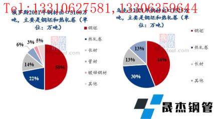 俄、烏均是產(chǎn)鋼大國和厚壁無縫鋼管主要出口國,兩國主要出口產(chǎn)品均為鋼坯、熱軋卷、長材。據(jù)世界鋼協(xié)統(tǒng)計,2021年,俄、烏粗鋼產(chǎn)量分別為7600萬噸和2140萬噸,產(chǎn)量在全球排名第五和第十四位,分別占全球粗鋼總產(chǎn)量的3.9%和1.1%。