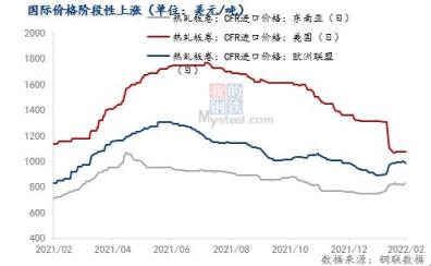 國際鋼價自俄烏沖突以來迎來了階段性上漲。截至2月28日,歐盟及東南亞進口CFR價格月環(huán)比分別上漲100美元/噸和82美元/噸;同時,美國進口價格也在2月中下旬停止了下跌趨勢開始企穩(wěn)。