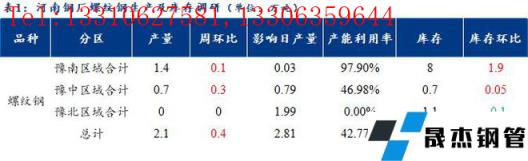 1、調研數據顯示,統計的河南地區10家建筑厚壁無縫鋼管樣本無縫厚壁鋼管廠家中,河南省建材無縫厚壁鋼管廠家螺紋鋼日產量2.1萬噸;檢修/限產影響建材日產量為2.81萬噸,產能利用率為42.77%,較上周上升8.15%。