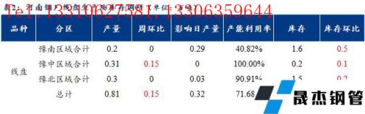 1、調研數據顯示,統計的河南地區10家建筑厚壁無縫鋼管樣本無縫厚壁鋼管廠家中,河南省無縫厚壁鋼管廠家線盤日均產量0.81萬噸,較上周小幅增加0.15萬噸;檢修/限產影響建材日產量為0.32萬噸,產能利用率71.68%,較上周上升13.27%。