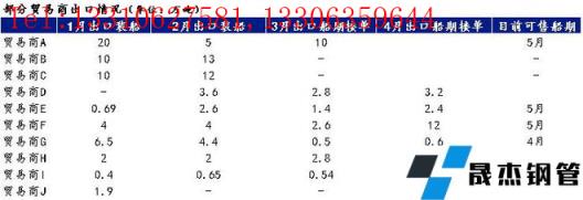 貿易商1:華北出口商。今年前兩個月合計出口在1萬噸左右,主要為鍍鋅產品,其中有部分之前延期的訂單。近期海外客戶對冷熱系產品詢單量明顯增加,多數為5月船期資源,目前正積極與無縫厚壁鋼管廠家及貨代公司溝通,盡量滿足客戶提出的交貨期。