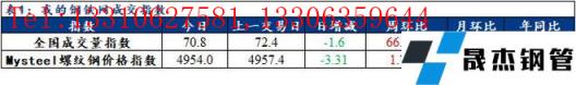 訊:全國建筑厚壁無縫鋼管成交量監測,成交量相對指數來看,全國70.8減1.6,北方34.5減3.4,華東104.9減4.5,南方56.7增2.2。今日螺紋鋼價格指數4954,較上一交易日減3.31。