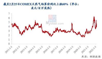 受俄烏沖突影響,截至2月25日,COMEX天然氣結算價4.485美元/百萬英熱,同比上漲60%。整個2月天然氣均價約為4.459,環(huán)比上漲12%,同比上漲54%,為2014年后的第二高點。