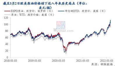除了天然氣,原油也是俄羅斯主要出口能源類型之一。今年2月,俄羅斯的石油產(chǎn)量同比增長9.3%,達到1105.5萬桶/日。在俄烏沖突之下,原油價格飆升。截至3月2日,美油價格一度沖破了111美元/桶,布油價格一度接近113美元/桶,布油美油的價格都創(chuàng)近8年新高。