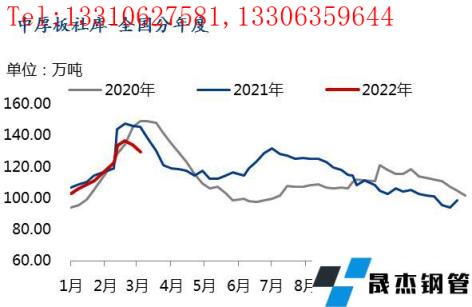 另一方面,21年四季度末無縫厚壁鋼管廠家品種鋼訂單轉(zhuǎn)好,很多無縫厚壁鋼管廠家對內(nèi)部品種結(jié)構(gòu)進(jìn)行了調(diào)整,以減少流通材,增加直供量為主,這一點(diǎn)也從我們節(jié)前一些品種鋼價格漲幅也能看出,包括橋梁板、高建鋼,Q355C, Q355D板等等,這些品種節(jié)前價格漲幅均高于普板和低合金板。所以進(jìn)一步導(dǎo)致市場流通材的量在減少,這一點(diǎn),也可以從我們今年春節(jié)后的社會庫存能夠得到驗證。今年春節(jié)后的中板社會庫存大幅低于去年同期,還有一方面原因是,今年大家冬儲的意愿非常低,投機(jī)性訂貨量較去年有明顯下降,多以協(xié)議量到貨為主。