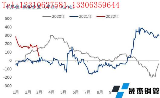 從品種價差方面的情況來看,2月份熱軋板卷與中厚板之間的價差為168.25元/噸,1月份熱軋板卷與中厚板之間的價差為196.94元/噸,價差縮小28.69元/噸;2021年同期數(shù)據(jù)為0.53元/噸,同比價差擴(kuò)大167.72元/噸。(備注:價差是指的中厚板價格減去熱軋板卷價格)具體情況如下圖所示: