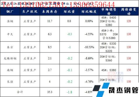 江蘇優特無縫厚壁鋼管廠家棒材總庫存35.3萬噸,較上周下降1.8萬噸,環比降4.85%,較去年同期下降4.68萬噸,同比降11.71%,目前江蘇優特無縫厚壁鋼管廠家均正常生產。