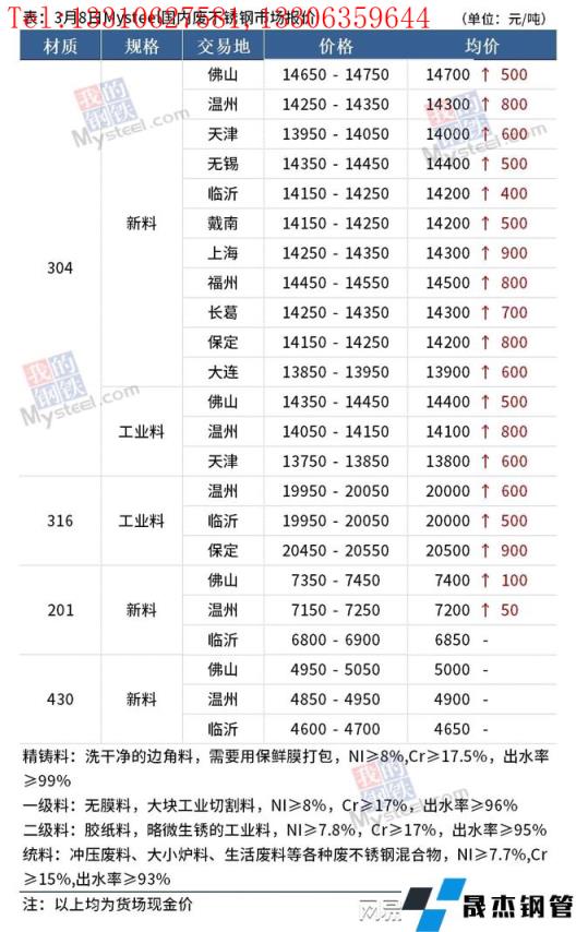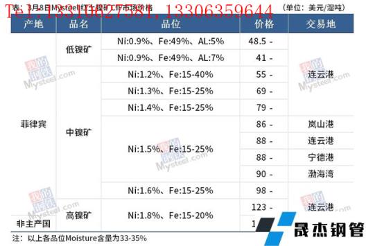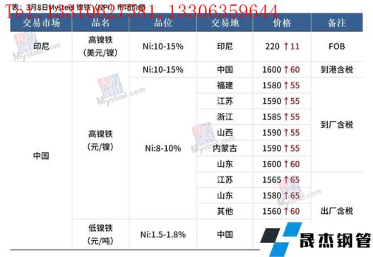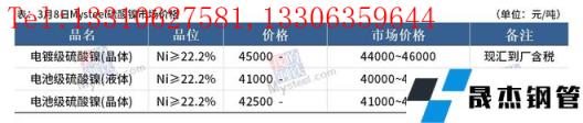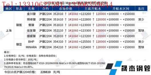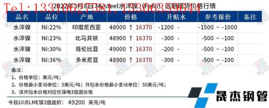 免責聲明:本網站(山東聊城晟杰無縫鋼管廠m.yztongfa.com)刊載的“鎳產業鏈價格(2022.3.8)”等均源于網絡,版權歸原作者所有,且僅代表原作者觀點,本文所載信息僅供參考。轉載僅為學習與交流之目的,如無意中侵犯您的合法權益,請及時聯系刪除。本網站刊登此篇文章并不意味著本站贊同其觀點或證實其內容的真實性,我們不對其科學性、嚴肅性等作任何形式的保證。如果侵犯了您的版權,請盡快聯系我們予以撤銷,謝謝合作!