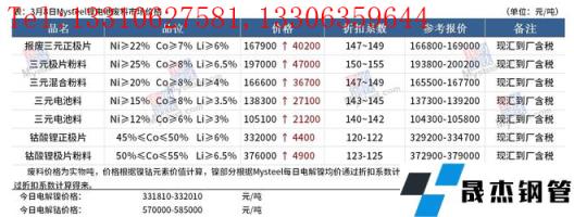 3月8日鋰電池廢料系數持平,其中三元正極片系數147-149,三元正極片粉系數150-155,鈷酸鋰極片系數120-122,鈷酸鋰極片粉料系數123-125。
