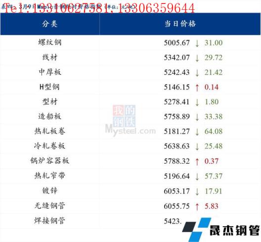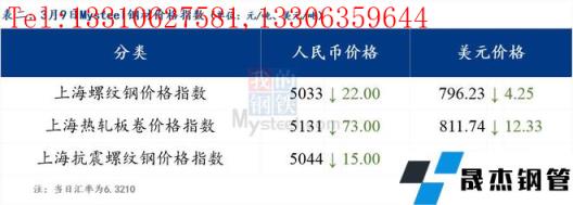 3月9日普鋼絕對價(jià)格指數(shù)變化:綜合指數(shù)5270.61,下跌34.55;螺紋鋼指數(shù)5005.67,下跌31.0;線材指數(shù)5342.07,下跌29.72;熱軋板卷指數(shù)5181.27,下跌64.08;冷軋板卷指數(shù)5638.63,下跌25.48;中厚板指數(shù)5242.43,下跌21.42。