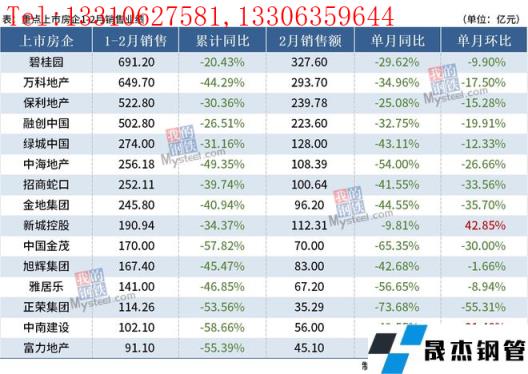 免責聲明:本網站(山東聊城晟杰無縫鋼管廠m.yztongfa.com)刊載的“15家重點房企2月銷售同比降幅擴大,房地產下行壓力持續”等均源于網絡,版權歸原作者所有,且僅代表原作者觀點,本文所載信息僅供參考。轉載僅為學習與交流之目的,如無意中侵犯您的合法權益,請及時聯系刪除。本網站刊登此篇文章并不意味著本站贊同其觀點或證實其內容的真實性,我們不對其科學性、嚴肅性等作任何形式的保證。如果侵犯了您的版權,請盡快聯系我們予以撤銷,謝謝合作!