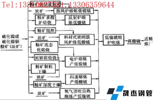 硫化鎳礦的火法冶煉主要包括造锍熔煉、低鎳锍轉爐吹煉、高鎳锍加硫酸分離得到硫酸鎳,硫酸鎳進一步電解精煉得到電解鎳。
