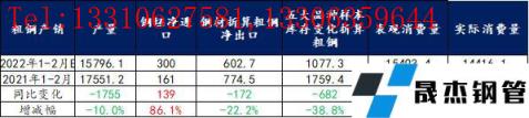 依據(jù)統(tǒng)計局發(fā)布數(shù)據(jù),2022年1-2月累計粗鋼產(chǎn)量同比降幅約10%左右,絕對量達(dá)到1.6億噸,去年同期約為1.8億噸;受今年國外形勢變化,鋼坯預(yù)估凈進(jìn)口同比增幅達(dá)到86%,厚壁無縫鋼管折算粗鋼凈出口降幅達(dá)到22%,因此測算粗鋼表觀消費(fèi)量達(dá)到1.55億噸,同比降幅約8.6%;另外考慮到庫存變化因素,將其折算至粗鋼,測算粗鋼實(shí)際消費(fèi)量達(dá)到1.44億噸,同比降幅約5%,需求降幅表現(xiàn)明顯好于市場預(yù)期。
