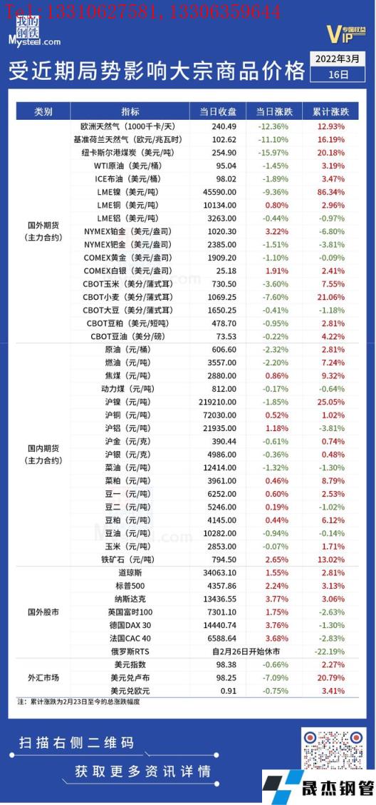 近期,受國際局勢影響,全球金融及大宗商品市場出現較大波動。據央視新聞報道,俄烏雙方準備好了一份在烏克蘭保持中立、裁軍的前提下實施的停火撤軍計劃,國際能源價格繼續大跌。倫敦金屬交易所則宣布,將不會發布周三收盤價,因為鎳價在收盤價確定期間處于跌停狀態。跌停價45590美元/噸將繼續用于LME清算所的保證金計算,以及周四漲跌停的基礎。另外,美聯儲加息如期而至,美國三大股指跌宕起伏走出V型反彈。匯總情況如下: